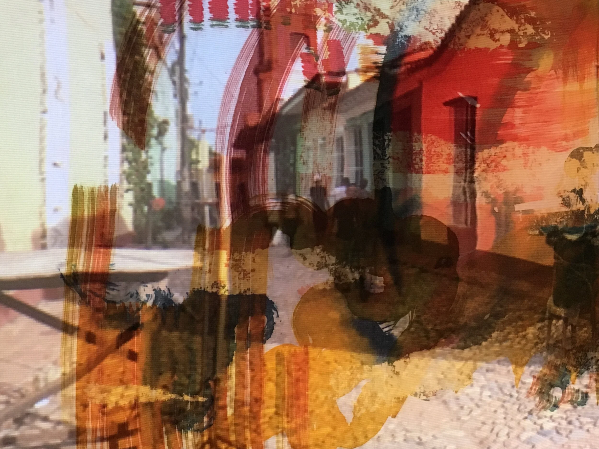 Images composées de photographies prises à Cuba, elles-mêmes projetées sur du tissu peint et imprimé à la main. Cette superposition de couches joue avec couleurs, transparences et textures.